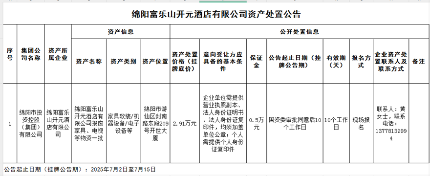 綿陽(yáng)富樂(lè)山開(kāi)元酒店有限公司資產(chǎn)處置公告