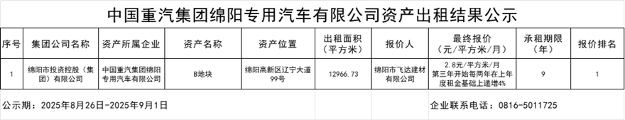 中國重汽集團(tuán)綿陽專用汽車有限公司資產(chǎn)出租結(jié)果公示