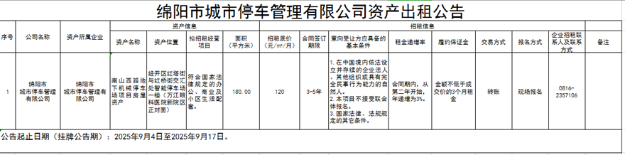 綿陽(yáng)市城市停車(chē)管理有限公司資產(chǎn)出租公告