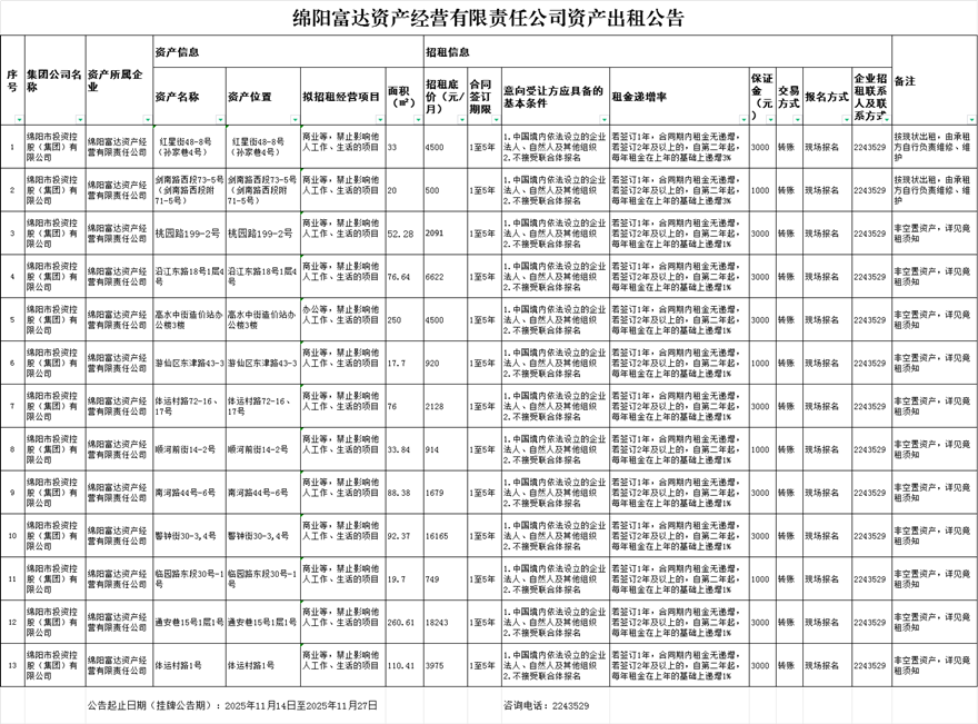 綿陽富達(dá)資產(chǎn)經(jīng)營有限責(zé)任公司資產(chǎn)出租公告