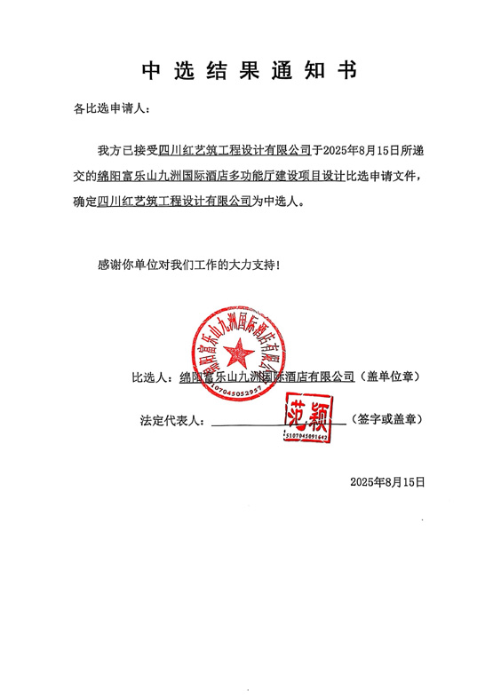 綿陽富樂山九洲國際酒店多功能廳建設(shè)項(xiàng)目設(shè)計(jì)中選結(jié)果通知